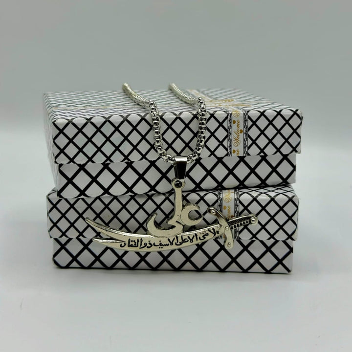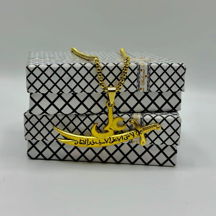 Honor the legacy of valor and faith with the Ali Zulfiqar Pendant — a tribute to the legendary sword of Imam Ali (AS). Intricately crafted in gold and silver finishes, this dual-pointed blade pendant symbolizes strength, justice, and spiritual devotion. The elegant Arabic calligraphy and bold silhouette make it a powerful personal emblem or gift steeped in meaning and heritage.